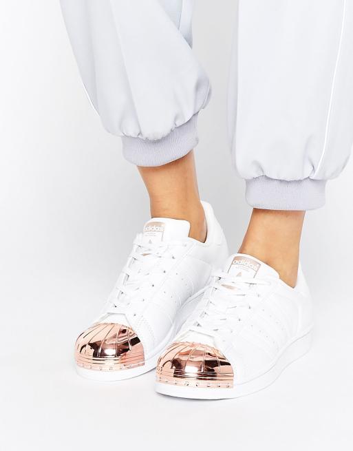 Adidas Originals White Superstar Sneakers With Rose Gold Metal Toe