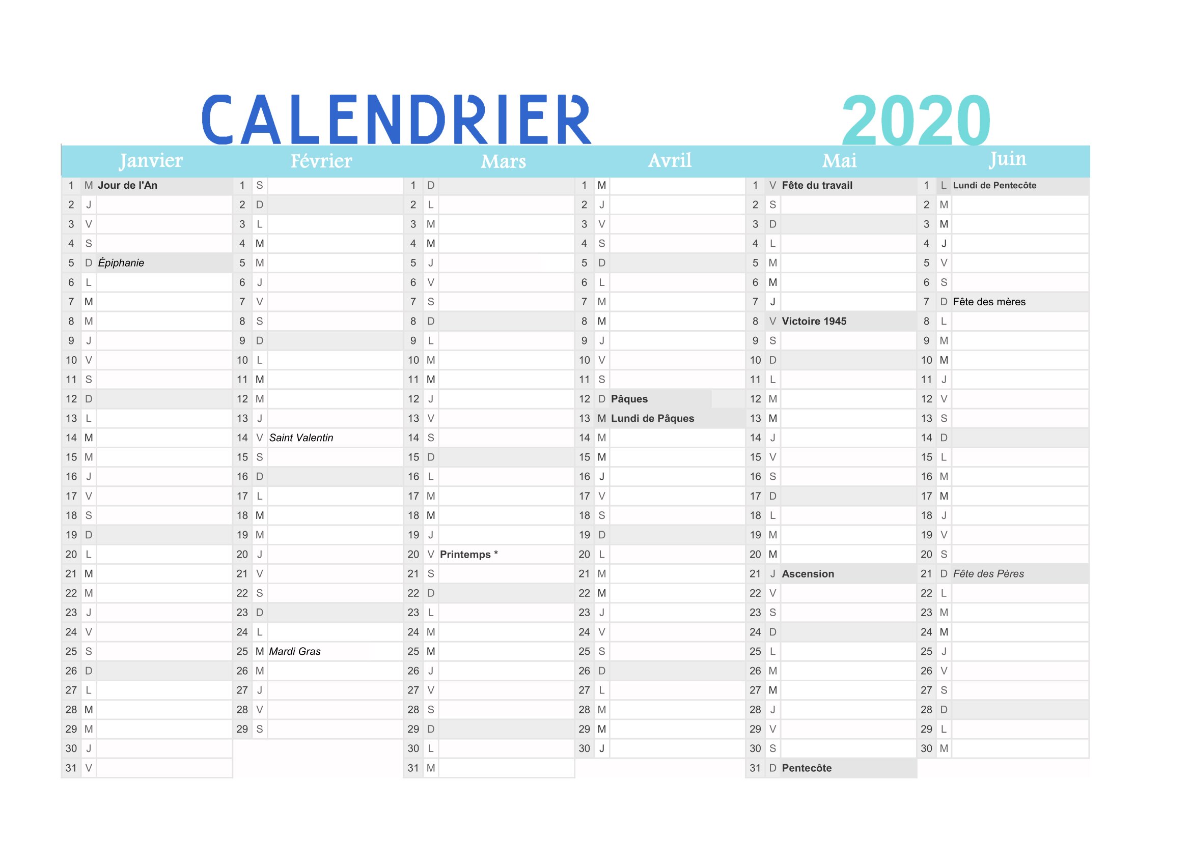 Calendrier 2020 A Imprimer Jours Feries Vacances Numeros De